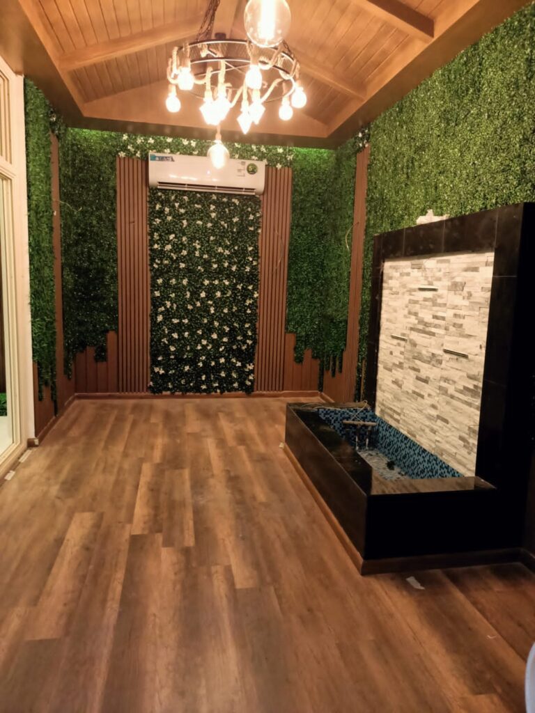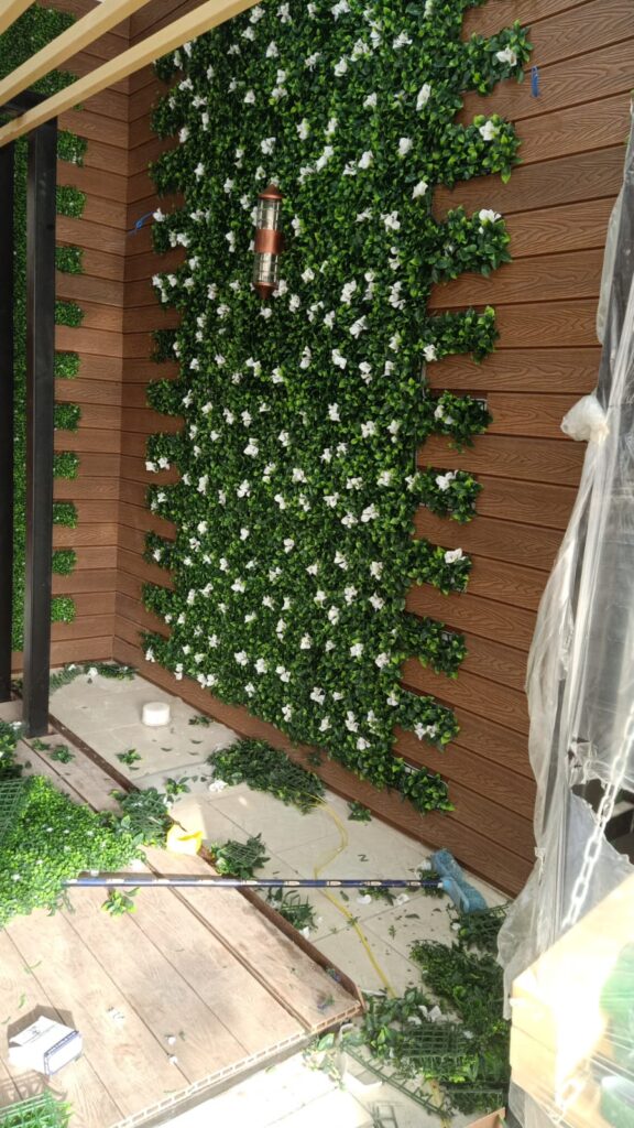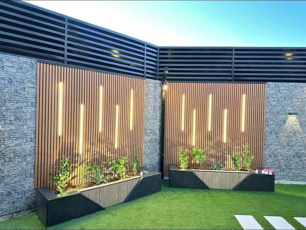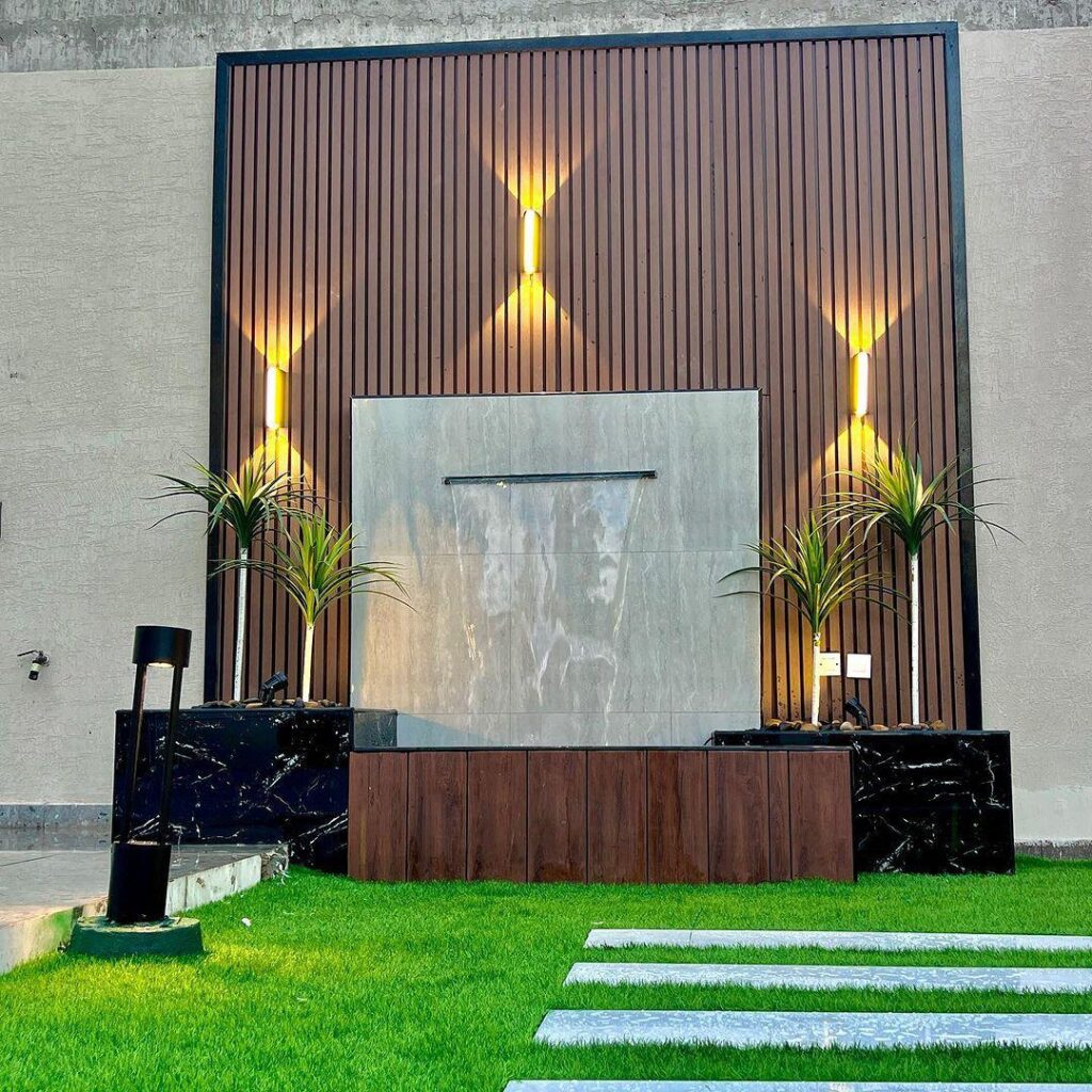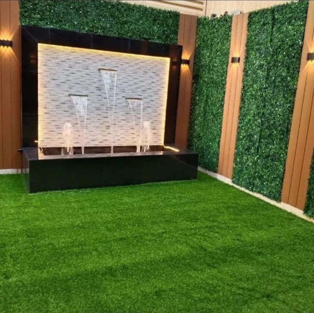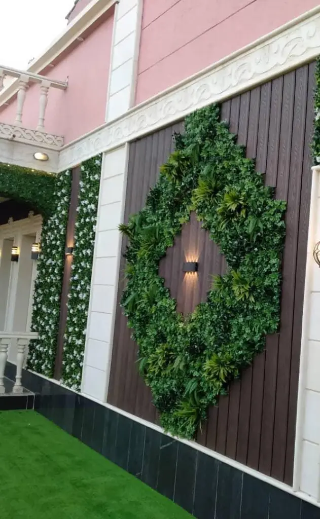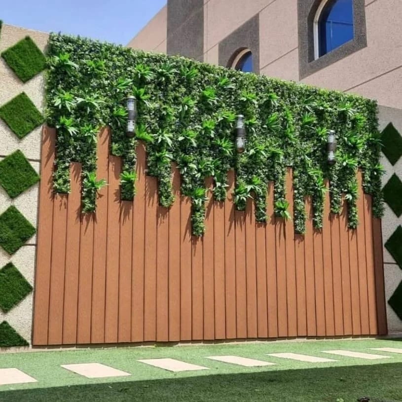 دمج العشب مع الخشب: يُعد دمج ألواح العشب مع “بديل الخشب” أو التكسيات الخشبية من أشهر التصاميم الحديثة للمداخل والصالات.
